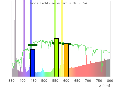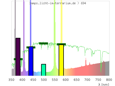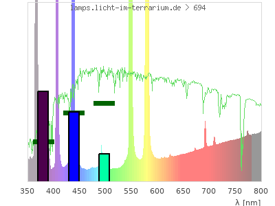 Whereas a spectrometer measures the intensity in every tiny wavelength interval resulting in thousands of individual intensities, the human eye only measures three intensities detected by the three cones. The same is true for the reptile eye with usually three or four photoreceptors. Effectively the detailled spectrum displayed above reduces to a much compacter bar graph displayed below. The photoreceptor sensitivites from these L-Cone, M-Cone, S-Cone, and U-Cone are used, they are chosen as an average of measured reptile photoreceptor sensitivity curves. The bar graph also shows as reference the intensity seen by the three or four photoreceptors for average sunlight (id 1).