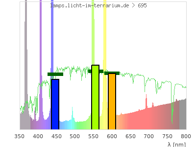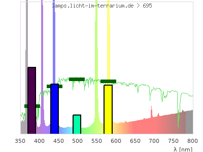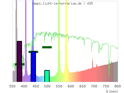 Whereas a spectrometer measures the intensity in every tiny wavelength interval resulting in thousands of individual intensities, the human eye only measures three intensities detected by the three cones. The same is true for the reptile eye with usually three or four photoreceptors. Effectively the detailled spectrum displayed above reduces to a much compacter bar graph displayed below. The photoreceptor sensitivites from these L-Cone, M-Cone, S-Cone, and U-Cone are used, they are chosen as an average of measured reptile photoreceptor sensitivity curves. The bar graph also shows as reference the intensity seen by the three or four photoreceptors for average sunlight (id 1).