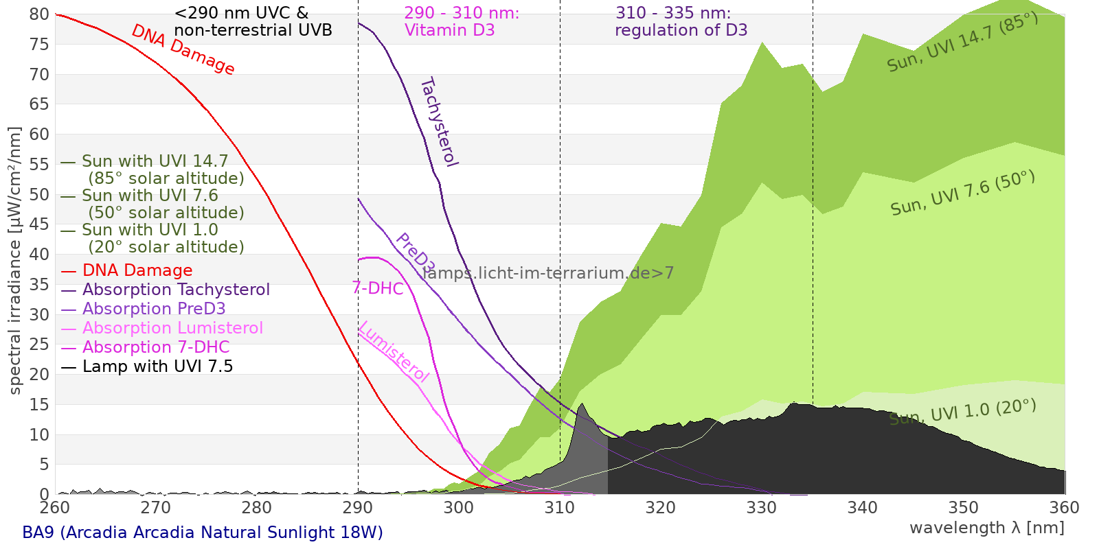Erythema 0.932 UV-Index Pyrimidine dimerization of DNA 4.94 µW/cm² Photoceratitis 1.18 µW/cm² Photoconjunctivitis 0.882 µW/cm² DNA Damage 1.02 Vitamin D3 2.22 µW/cm² Photosynthesis 405 µW/cm² Luminosity 1910 lx Human L-Cone 287 µW/cm² Human M-Cone 235 µW/cm² Human S-Cone 135 µW/cm² CIE X 260 µW/cm² CIE Y 265 µW/cm² CIE Z 252 µW/cm² PAR PPFD 27.9 µmol/m²/s Extinction preD3 23.4 e-3*m²/mol Extinction Tachysterol 69.9 e-3*m²/mol Exctincition PreD3 15700 m²/mol Extinction Lumisterol 9.42 m²/mol Exctincition Tachysterol 98700 m²/mol Extinction 7DHC 10.6 m²/mol L-Cone 240 µW/cm² M-Cone 227 µW/cm² S-Cone 228 µW/cm² U-Cone 80.3 µW/cm² UVR - ICNIRP 2004 1.2 Rel Biol Eff Melatonin Supression 196 µW/cm² Blue Light Hazard 153 µW/cm² (79.9 µW/cm² per 1000 lx) CIE 174:2006 PreVit D3 2.36 µW/cm² Lumen Reptil 1850 "pseudo-lx" Vitamin D3 Degradation 2.91 µW/cm² Actinic UV 1.2 µW/cm² (6.26 mW/klm) Exctincition Lumisterol 10700 m²/mol Exctincition 7DHC 11300 m²/mol Exctincition Toxisterols 5830 m²/mol