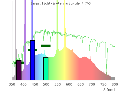 Whereas a spectrometer measures the intensity in every tiny wavelength interval resulting in thousands of individual intensities, the human eye only measures three intensities detected by the three cones. The same is true for the reptile eye with usually three or four photoreceptors. Effectively the detailled spectrum displayed above reduces to a much compacter bar graph displayed below. The photoreceptor sensitivites from these L-Cone, M-Cone, S-Cone, and U-Cone are used, they are chosen as an average of measured reptile photoreceptor sensitivity curves. The bar graph also shows as reference the intensity seen by the three or four photoreceptors for average sunlight (id 1).