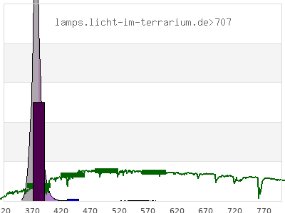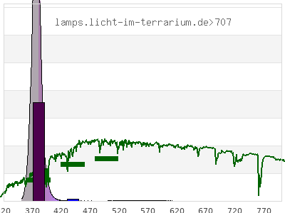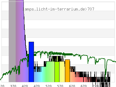 total ( 0 nm - 0 nm) 640 µW/cm² = 6.4 W/m² UVC ( 0 nm - 280 nm) 0 µW/cm² = 0 W/m² non-terrestrial ( 0 nm - 290 nm) 0 µW/cm² = 0 W/m² total2 ( 250 nm - 880 nm) 640 µW/cm² = 6.4 W/m² UVB (EU) ( 280 nm - 315 nm) 0 µW/cm² = 0 W/m² UVB (US) ( 280 nm - 320 nm) 0 µW/cm² = 0 W/m² UVA+B ( 280 nm - 380 nm) 469 µW/cm² = 4.69 W/m² Solar UVB ( 290 nm - 315 nm) 0 µW/cm² = 0 W/m² UVA D3 regulating ( 315 nm - 335 nm) 0 µW/cm² = 0 W/m² UVA (EU) ( 315 nm - 380 nm) 469 µW/cm² = 4.69 W/m² UVA2 (medical definition) ( 320 nm - 340 nm) 0 µW/cm² = 0 W/m² UVA (US) ( 320 nm - 380 nm) 469 µW/cm² = 4.69 W/m² UVA1 (variant) ( 335 nm - 380 nm) 469 µW/cm² = 4.69 W/m² UVA1 (medical) ( 340 nm - 400 nm) 624 µW/cm² = 6.24 W/m² vis. UVA ( 350 nm - 380 nm) 469 µW/cm² = 4.69 W/m² VIS Rep3 ( 350 nm - 600 nm) 638 µW/cm² = 6.38 W/m² VIS Rep4 ( 350 nm - 700 nm) 639 µW/cm² = 6.39 W/m² purple ( 380 nm - 420 nm) 162 µW/cm² = 1.62 W/m² VIS ( 380 nm - 780 nm) 171 µW/cm² = 1.71 W/m² VIS2 ( 400 nm - 680 nm) 15.1 µW/cm² = 0.151 W/m² PAR ( 400 nm - 700 nm) 15.3 µW/cm² = 0.153 W/m² tmp ( 400 nm - 1100 nm) 15.5 µW/cm² = 0.155 W/m² blue ( 420 nm - 490 nm) 2.51 µW/cm² = 0.0251 W/m² green ( 490 nm - 575 nm) 3.5 µW/cm² = 0.035 W/m² yellow ( 575 nm - 585 nm) 0.421 µW/cm² = 0.00421 W/m² orange ( 585 nm - 650 nm) 1.79 µW/cm² = 0.0179 W/m² red ( 650 nm - 780 nm) 0.803 µW/cm² = 0.00803 W/m² IR2 ( 655 nm - 685 nm) 0.365 µW/cm² = 0.00365 W/m² IRA ( 700 nm - 1400 nm) 0.226 µW/cm² = 0.00226 W/m² IRB ( 1400 nm - 3000 nm) 0 µW/cm² = 0 W/m²