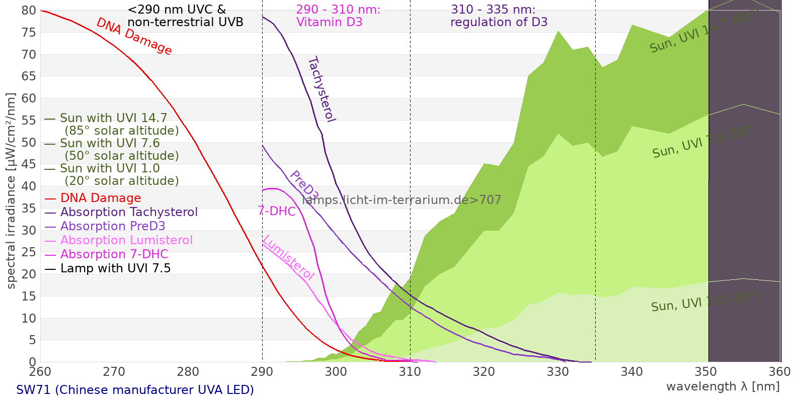 This process prevents any overdose of vitamin D3 from UV radiation with a spectrum similar to sunlight. As a comparison the solar spectra at 20°(id:14) and at 85°(id:21) solar angle are shown.
