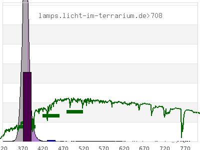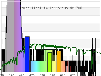 total ( 0 nm - 0 nm) 258 µW/cm² = 2.58 W/m² UVC ( 0 nm - 280 nm) 0 µW/cm² = 0 W/m² non-terrestrial ( 0 nm - 290 nm) 0 µW/cm² = 0 W/m² total2 ( 250 nm - 880 nm) 258 µW/cm² = 2.58 W/m² UVB (EU) ( 280 nm - 315 nm) 0.204 µW/cm² = 0.00204 W/m² UVB (US) ( 280 nm - 320 nm) 0.274 µW/cm² = 0.00274 W/m² UVA+B ( 280 nm - 380 nm) 189 µW/cm² = 1.89 W/m² Solar UVB ( 290 nm - 315 nm) 0.204 µW/cm² = 0.00204 W/m² UVA D3 regulating ( 315 nm - 335 nm) 0.26 µW/cm² = 0.0026 W/m² UVA (EU) ( 315 nm - 380 nm) 189 µW/cm² = 1.89 W/m² UVA2 (medical definition) ( 320 nm - 340 nm) 0.294 µW/cm² = 0.00294 W/m² UVA (US) ( 320 nm - 380 nm) 188 µW/cm² = 1.88 W/m² UVA1 (variant) ( 335 nm - 380 nm) 188 µW/cm² = 1.88 W/m² UVA1 (medical) ( 340 nm - 400 nm) 250 µW/cm² = 2.5 W/m² vis. UVA ( 350 nm - 380 nm) 188 µW/cm² = 1.88 W/m² VIS Rep3 ( 350 nm - 600 nm) 255 µW/cm² = 2.55 W/m² VIS Rep4 ( 350 nm - 700 nm) 256 µW/cm² = 2.56 W/m² purple ( 380 nm - 420 nm) 64.8 µW/cm² = 0.648 W/m² VIS ( 380 nm - 780 nm) 68.9 µW/cm² = 0.689 W/m² VIS2 ( 400 nm - 680 nm) 6.39 µW/cm² = 0.0639 W/m² PAR ( 400 nm - 700 nm) 6.48 µW/cm² = 0.0648 W/m² tmp ( 400 nm - 1100 nm) 6.73 µW/cm² = 0.0673 W/m² blue ( 420 nm - 490 nm) 1.07 µW/cm² = 0.0107 W/m² green ( 490 nm - 575 nm) 1.54 µW/cm² = 0.0154 W/m² yellow ( 575 nm - 585 nm) 0.193 µW/cm² = 0.00193 W/m² orange ( 585 nm - 650 nm) 0.812 µW/cm² = 0.00812 W/m² red ( 650 nm - 780 nm) 0.513 µW/cm² = 0.00513 W/m² IR2 ( 655 nm - 685 nm) 0.179 µW/cm² = 0.00179 W/m² IRA ( 700 nm - 1400 nm) 0.245 µW/cm² = 0.00245 W/m² IRB ( 1400 nm - 3000 nm) 0 µW/cm² = 0 W/m²