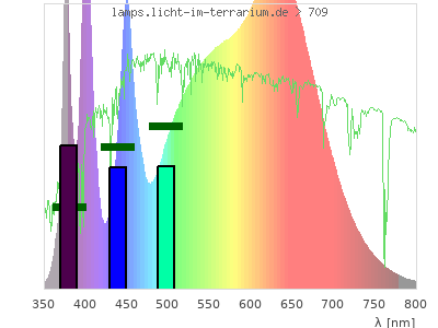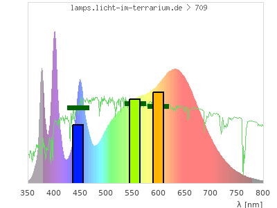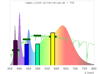 Whereas a spectrometer measures the intensity in every tiny wavelength interval resulting in thousands of individual intensities, the human eye only measures three intensities detected by the three cones. The same is true for the reptile eye with usually three or four photoreceptors. Effectively the detailled spectrum displayed above reduces to a much compacter bar graph displayed below. The photoreceptor sensitivites from these L-Cone, M-Cone, S-Cone, and U-Cone are used, they are chosen as an average of measured reptile photoreceptor sensitivity curves. The bar graph also shows as reference the intensity seen by the three or four photoreceptors for average sunlight (id 1).