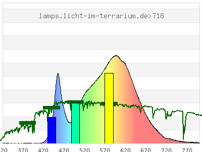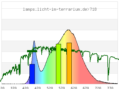 total ( 0 nm - 0 nm) 4010 µW/cm² = 40.1 W/m² UVC ( 0 nm - 280 nm) 0 µW/cm² = 0 W/m² non-terrestrial ( 0 nm - 290 nm) 0 µW/cm² = 0 W/m² total2 ( 250 nm - 880 nm) 4000 µW/cm² = 40 W/m² UVB (EU) ( 280 nm - 315 nm) 1.41 µW/cm² = 0.0141 W/m² UVB (US) ( 280 nm - 320 nm) 1.76 µW/cm² = 0.0176 W/m² UVA+B ( 280 nm - 380 nm) 5.4 µW/cm² = 0.054 W/m² Solar UVB ( 290 nm - 315 nm) 1.41 µW/cm² = 0.0141 W/m² UVA D3 regulating ( 315 nm - 335 nm) 1.44 µW/cm² = 0.0144 W/m² UVA (EU) ( 315 nm - 380 nm) 3.98 µW/cm² = 0.0398 W/m² UVA2 (medical definition) ( 320 nm - 340 nm) 1.36 µW/cm² = 0.0136 W/m² UVA (US) ( 320 nm - 380 nm) 3.64 µW/cm² = 0.0364 W/m² UVA1 (variant) ( 335 nm - 380 nm) 2.54 µW/cm² = 0.0254 W/m² UVA1 (medical) ( 340 nm - 400 nm) 3.32 µW/cm² = 0.0332 W/m² vis. UVA ( 350 nm - 380 nm) 1.68 µW/cm² = 0.0168 W/m² VIS Rep3 ( 350 nm - 600 nm) 2520 µW/cm² = 25.2 W/m² VIS Rep4 ( 350 nm - 700 nm) 3890 µW/cm² = 38.9 W/m² purple ( 380 nm - 420 nm) 3.98 µW/cm² = 0.0398 W/m² VIS ( 380 nm - 780 nm) 3980 µW/cm² = 39.8 W/m² VIS2 ( 400 nm - 680 nm) 3800 µW/cm² = 38 W/m² PAR ( 400 nm - 700 nm) 3890 µW/cm² = 38.9 W/m² tmp ( 400 nm - 1100 nm) 4000 µW/cm² = 40 W/m² blue ( 420 nm - 490 nm) 607 µW/cm² = 6.07 W/m² green ( 490 nm - 575 nm) 1300 µW/cm² = 13 W/m² yellow ( 575 nm - 585 nm) 237 µW/cm² = 2.37 W/m² orange ( 585 nm - 650 nm) 1370 µW/cm² = 13.7 W/m² red ( 650 nm - 780 nm) 459 µW/cm² = 4.59 W/m² IR2 ( 655 nm - 685 nm) 245 µW/cm² = 2.45 W/m² IRA ( 700 nm - 1400 nm) 110 µW/cm² = 1.1 W/m² IRB ( 1400 nm - 3000 nm) 0 µW/cm² = 0 W/m²