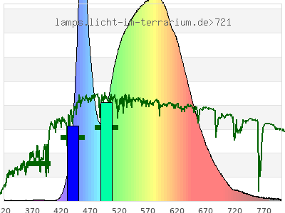 total ( 0 nm - 0 nm) 4080 µW/cm² = 40.8 W/m² UVC ( 0 nm - 280 nm) 0 µW/cm² = 0 W/m² non-terrestrial ( 0 nm - 290 nm) 0 µW/cm² = 0 W/m² total2 ( 250 nm - 880 nm) 4080 µW/cm² = 40.8 W/m² UVB (EU) ( 280 nm - 315 nm) 1.38 µW/cm² = 0.0138 W/m² UVB (US) ( 280 nm - 320 nm) 1.8 µW/cm² = 0.018 W/m² UVA+B ( 280 nm - 380 nm) 5.42 µW/cm² = 0.0542 W/m² Solar UVB ( 290 nm - 315 nm) 1.38 µW/cm² = 0.0138 W/m² UVA D3 regulating ( 315 nm - 335 nm) 1.44 µW/cm² = 0.0144 W/m² UVA (EU) ( 315 nm - 380 nm) 4.05 µW/cm² = 0.0405 W/m² UVA2 (medical definition) ( 320 nm - 340 nm) 1.23 µW/cm² = 0.0123 W/m² UVA (US) ( 320 nm - 380 nm) 3.62 µW/cm² = 0.0362 W/m² UVA1 (variant) ( 335 nm - 380 nm) 2.6 µW/cm² = 0.026 W/m² UVA1 (medical) ( 340 nm - 400 nm) 3.5 µW/cm² = 0.035 W/m² vis. UVA ( 350 nm - 380 nm) 1.83 µW/cm² = 0.0183 W/m² VIS Rep3 ( 350 nm - 600 nm) 2940 µW/cm² = 29.4 W/m² VIS Rep4 ( 350 nm - 700 nm) 3990 µW/cm² = 39.9 W/m² purple ( 380 nm - 420 nm) 5.24 µW/cm² = 0.0524 W/m² VIS ( 380 nm - 780 nm) 4060 µW/cm² = 40.6 W/m² VIS2 ( 400 nm - 680 nm) 3920 µW/cm² = 39.2 W/m² PAR ( 400 nm - 700 nm) 3980 µW/cm² = 39.8 W/m² tmp ( 400 nm - 1100 nm) 4070 µW/cm² = 40.7 W/m² blue ( 420 nm - 490 nm) 922 µW/cm² = 9.22 W/m² green ( 490 nm - 575 nm) 1470 µW/cm² = 14.7 W/m² yellow ( 575 nm - 585 nm) 223 µW/cm² = 2.23 W/m² orange ( 585 nm - 650 nm) 1090 µW/cm² = 10.9 W/m² red ( 650 nm - 780 nm) 346 µW/cm² = 3.46 W/m² IR2 ( 655 nm - 685 nm) 181 µW/cm² = 1.81 W/m² IRA ( 700 nm - 1400 nm) 86.3 µW/cm² = 0.863 W/m² IRB ( 1400 nm - 3000 nm) 0 µW/cm² = 0 W/m²