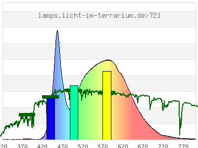 Whereas a spectrometer measures the intensity in every tiny wavelength interval resulting in thousands of individual intensities, the human eye only measures three intensities detected by the three cones. The same is true for the reptile eye with usually three or four photoreceptors. Effectively the detailled spectrum displayed above reduces to a much compacter bar graph displayed below. The photoreceptor sensitivites from these L-Cone, M-Cone, S-Cone, and U-Cone are used, they are chosen as an average of measured reptile photoreceptor sensitivity curves. The bar graph also shows as reference the intensity seen by the three or four photoreceptors for average sunlight (ASTM spectrum).