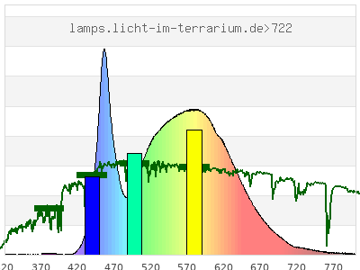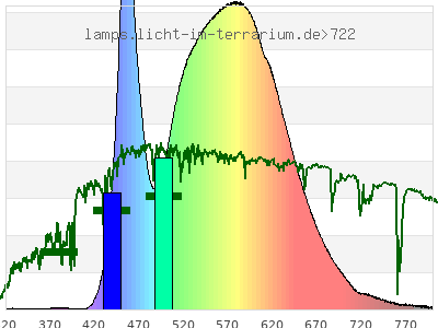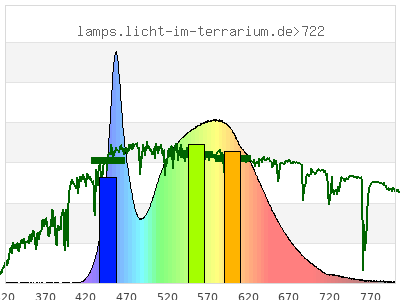 total ( 0 nm - 0 nm) 4050 µW/cm² = 40.5 W/m² UVC ( 0 nm - 280 nm) 0 µW/cm² = 0 W/m² non-terrestrial ( 0 nm - 290 nm) 0 µW/cm² = 0 W/m² total2 ( 250 nm - 880 nm) 4050 µW/cm² = 40.5 W/m² UVB (EU) ( 280 nm - 315 nm) 1.28 µW/cm² = 0.0128 W/m² UVB (US) ( 280 nm - 320 nm) 1.7 µW/cm² = 0.017 W/m² UVA+B ( 280 nm - 380 nm) 5.21 µW/cm² = 0.0521 W/m² Solar UVB ( 290 nm - 315 nm) 1.28 µW/cm² = 0.0128 W/m² UVA D3 regulating ( 315 nm - 335 nm) 1.46 µW/cm² = 0.0146 W/m² UVA (EU) ( 315 nm - 380 nm) 3.93 µW/cm² = 0.0393 W/m² UVA2 (medical definition) ( 320 nm - 340 nm) 1.26 µW/cm² = 0.0126 W/m² UVA (US) ( 320 nm - 380 nm) 3.51 µW/cm² = 0.0351 W/m² UVA1 (variant) ( 335 nm - 380 nm) 2.47 µW/cm² = 0.0247 W/m² UVA1 (medical) ( 340 nm - 400 nm) 3.38 µW/cm² = 0.0338 W/m² vis. UVA ( 350 nm - 380 nm) 1.61 µW/cm² = 0.0161 W/m² VIS Rep3 ( 350 nm - 600 nm) 2960 µW/cm² = 29.6 W/m² VIS Rep4 ( 350 nm - 700 nm) 3970 µW/cm² = 39.7 W/m² purple ( 380 nm - 420 nm) 5.41 µW/cm² = 0.0541 W/m² VIS ( 380 nm - 780 nm) 4030 µW/cm² = 40.3 W/m² VIS2 ( 400 nm - 680 nm) 3900 µW/cm² = 39 W/m² PAR ( 400 nm - 700 nm) 3960 µW/cm² = 39.6 W/m² tmp ( 400 nm - 1100 nm) 4050 µW/cm² = 40.5 W/m² blue ( 420 nm - 490 nm) 944 µW/cm² = 9.44 W/m² green ( 490 nm - 575 nm) 1470 µW/cm² = 14.7 W/m² yellow ( 575 nm - 585 nm) 220 µW/cm² = 2.2 W/m² orange ( 585 nm - 650 nm) 1060 µW/cm² = 10.6 W/m² red ( 650 nm - 780 nm) 333 µW/cm² = 3.33 W/m² IR2 ( 655 nm - 685 nm) 175 µW/cm² = 1.75 W/m² IRA ( 700 nm - 1400 nm) 82 µW/cm² = 0.82 W/m² IRB ( 1400 nm - 3000 nm) 0 µW/cm² = 0 W/m²