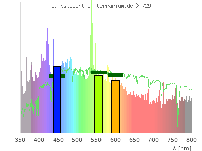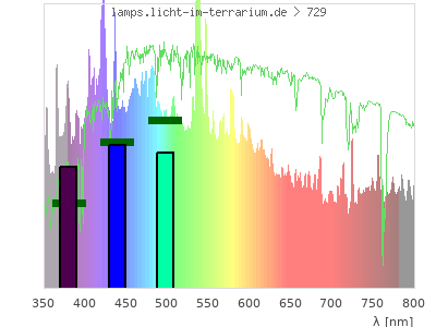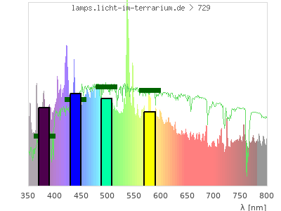 Whereas a spectrometer measures the intensity in every tiny wavelength interval resulting in thousands of individual intensities, the human eye only measures three intensities detected by the three cones. The same is true for the reptile eye with usually three or four photoreceptors. Effectively the detailled spectrum displayed above reduces to a much compacter bar graph displayed below. The photoreceptor sensitivites from these L-Cone, M-Cone, S-Cone, and U-Cone are used, they are chosen as an average of measured reptile photoreceptor sensitivity curves. The bar graph also shows as reference the intensity seen by the three or four photoreceptors for average sunlight (id 1).