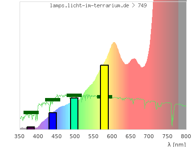 Whereas a spectrometer measures the intensity in every tiny wavelength interval resulting in thousands of individual intensities, the human eye only measures three intensities detected by the three cones. The same is true for the reptile eye with usually three or four photoreceptors. Effectively the detailled spectrum displayed above reduces to a much compacter bar graph displayed below. The photoreceptor sensitivites from these L-Cone, M-Cone, S-Cone, and U-Cone are used, they are chosen as an average of measured reptile photoreceptor sensitivity curves. The bar graph also shows as reference the intensity seen by the three or four photoreceptors for average sunlight (id 1).
