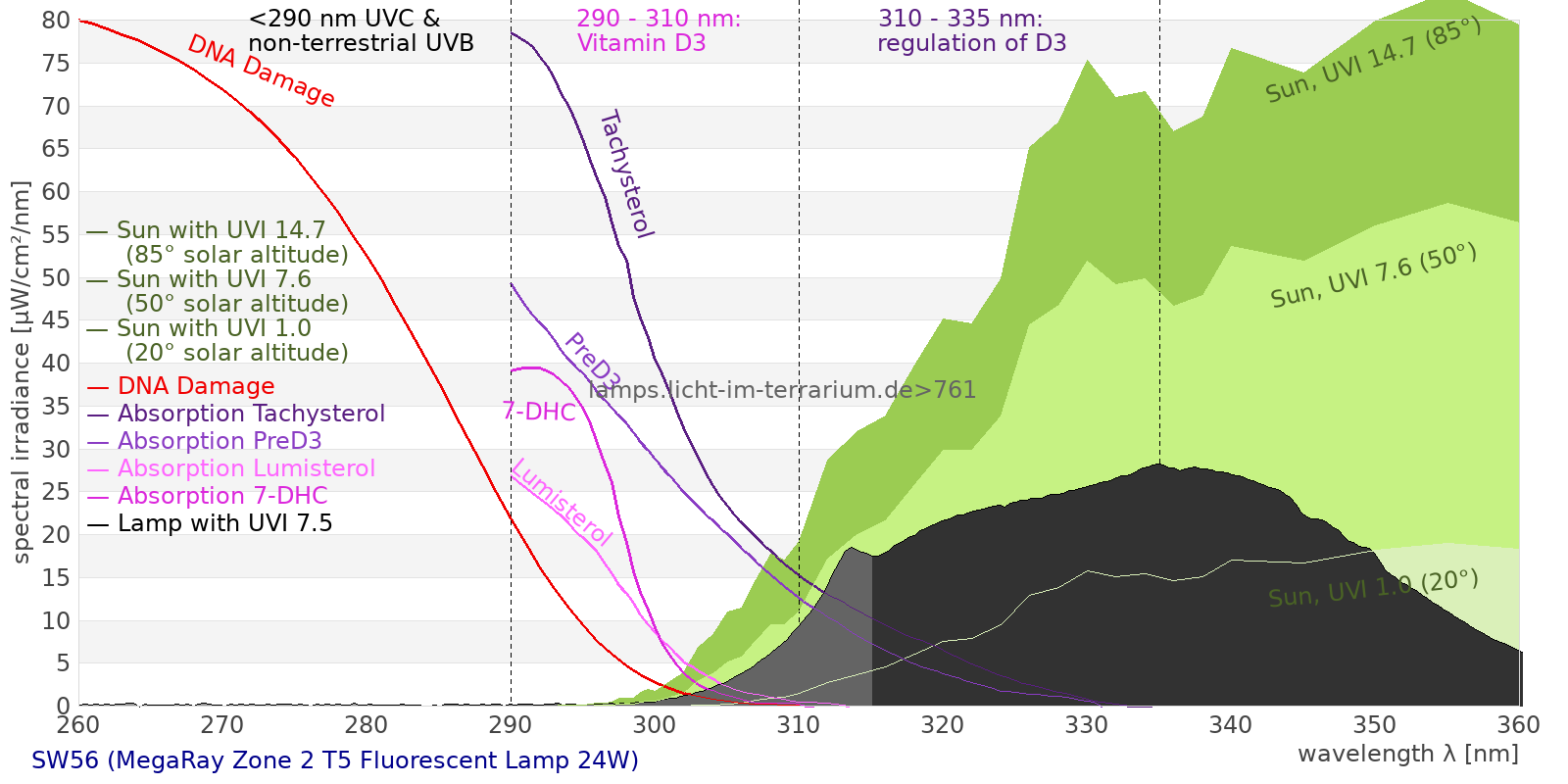 This process prevents any overdose of vitamin D3 from UV radiation with a spectrum similar to sunlight. As a comparison the solar spectra at 20°(id:14) and at 85°(id:21) solar angle are shown.
