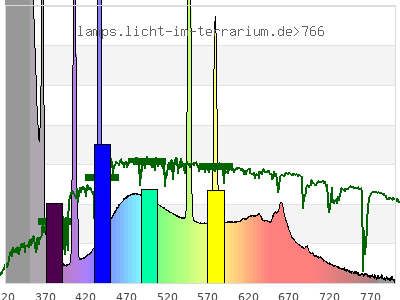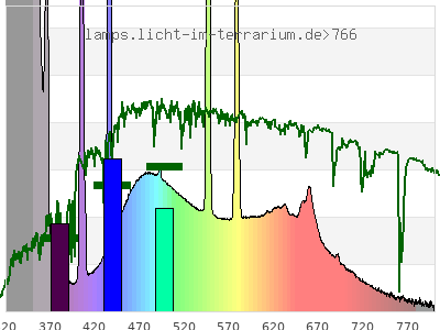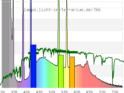 total ( 0 nm - 0 nm) 6250 µW/cm² = 62.5 W/m² UVC ( 0 nm - 280 nm) 296 µW/cm² = 2.96 W/m² non-terrestrial ( 0 nm - 290 nm) 300 µW/cm² = 3 W/m² total2 ( 250 nm - 880 nm) 5970 µW/cm² = 59.7 W/m² UVB (EU) ( 280 nm - 315 nm) 456 µW/cm² = 4.56 W/m² UVB (US) ( 280 nm - 320 nm) 782 µW/cm² = 7.82 W/m² UVA+B ( 280 nm - 380 nm) 3150 µW/cm² = 31.5 W/m² Solar UVB ( 290 nm - 315 nm) 452 µW/cm² = 4.52 W/m² UVA D3 regulating ( 315 nm - 335 nm) 1350 µW/cm² = 13.5 W/m² UVA (EU) ( 315 nm - 380 nm) 2690 µW/cm² = 26.9 W/m² UVA2 (medical definition) ( 320 nm - 340 nm) 1350 µW/cm² = 13.5 W/m² UVA (US) ( 320 nm - 380 nm) 2370 µW/cm² = 23.7 W/m² UVA1 (variant) ( 335 nm - 380 nm) 1340 µW/cm² = 13.4 W/m² UVA1 (medical) ( 340 nm - 400 nm) 1050 µW/cm² = 10.5 W/m² vis. UVA ( 350 nm - 380 nm) 455 µW/cm² = 4.55 W/m² VIS Rep3 ( 350 nm - 600 nm) 2580 µW/cm² = 25.8 W/m² VIS Rep4 ( 350 nm - 700 nm) 3120 µW/cm² = 31.2 W/m² purple ( 380 nm - 420 nm) 272 µW/cm² = 2.72 W/m² VIS ( 380 nm - 780 nm) 2780 µW/cm² = 27.8 W/m² VIS2 ( 400 nm - 680 nm) 2560 µW/cm² = 25.6 W/m² PAR ( 400 nm - 700 nm) 2630 µW/cm² = 26.3 W/m² tmp ( 400 nm - 1100 nm) 2770 µW/cm² = 27.7 W/m² blue ( 420 nm - 490 nm) 817 µW/cm² = 8.17 W/m² green ( 490 nm - 575 nm) 803 µW/cm² = 8.03 W/m² yellow ( 575 nm - 585 nm) 145 µW/cm² = 1.45 W/m² orange ( 585 nm - 650 nm) 391 µW/cm² = 3.91 W/m² red ( 650 nm - 780 nm) 347 µW/cm² = 3.47 W/m² IR2 ( 655 nm - 685 nm) 157 µW/cm² = 1.57 W/m² IRA ( 700 nm - 1400 nm) 142 µW/cm² = 1.42 W/m² IRB ( 1400 nm - 3000 nm) 0 µW/cm² = 0 W/m²