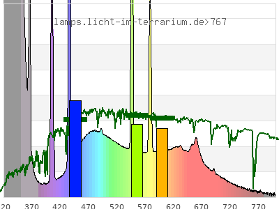 Whereas a spectrometer measures the intensity in every tiny wavelength interval resulting in thousands of individual intensities, the human eye only measures three intensities detected by the three cones. The same is true for the reptile eye with usually three or four photoreceptors. Effectively the detailled spectrum displayed above reduces to a much compacter bar graph displayed below. The photoreceptor sensitivites from these L-Cone, M-Cone, S-Cone, and U-Cone are used, they are chosen as an average of measured reptile photoreceptor sensitivity curves. The bar graph also shows as reference the intensity seen by the three or four photoreceptors for average sunlight (ASTM spectrum).