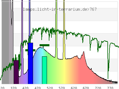 total ( 0 nm - 0 nm) 6400 µW/cm² = 64 W/m² UVC ( 0 nm - 280 nm) 230 µW/cm² = 2.3 W/m² non-terrestrial ( 0 nm - 290 nm) 235 µW/cm² = 2.35 W/m² total2 ( 250 nm - 880 nm) 6180 µW/cm² = 61.8 W/m² UVB (EU) ( 280 nm - 315 nm) 483 µW/cm² = 4.83 W/m² UVB (US) ( 280 nm - 320 nm) 825 µW/cm² = 8.25 W/m² UVA+B ( 280 nm - 380 nm) 3300 µW/cm² = 33 W/m² Solar UVB ( 290 nm - 315 nm) 479 µW/cm² = 4.79 W/m² UVA D3 regulating ( 315 nm - 335 nm) 1420 µW/cm² = 14.2 W/m² UVA (EU) ( 315 nm - 380 nm) 2810 µW/cm² = 28.1 W/m² UVA2 (medical definition) ( 320 nm - 340 nm) 1420 µW/cm² = 14.2 W/m² UVA (US) ( 320 nm - 380 nm) 2470 µW/cm² = 24.7 W/m² UVA1 (variant) ( 335 nm - 380 nm) 1400 µW/cm² = 14 W/m² UVA1 (medical) ( 340 nm - 400 nm) 1090 µW/cm² = 10.9 W/m² vis. UVA ( 350 nm - 380 nm) 473 µW/cm² = 4.73 W/m² VIS Rep3 ( 350 nm - 600 nm) 2650 µW/cm² = 26.5 W/m² VIS Rep4 ( 350 nm - 700 nm) 3200 µW/cm² = 32 W/m² purple ( 380 nm - 420 nm) 278 µW/cm² = 2.78 W/m² VIS ( 380 nm - 780 nm) 2840 µW/cm² = 28.4 W/m² VIS2 ( 400 nm - 680 nm) 2620 µW/cm² = 26.2 W/m² PAR ( 400 nm - 700 nm) 2690 µW/cm² = 26.9 W/m² tmp ( 400 nm - 1100 nm) 2830 µW/cm² = 28.3 W/m² blue ( 420 nm - 490 nm) 844 µW/cm² = 8.44 W/m² green ( 490 nm - 575 nm) 816 µW/cm² = 8.16 W/m² yellow ( 575 nm - 585 nm) 148 µW/cm² = 1.48 W/m² orange ( 585 nm - 650 nm) 400 µW/cm² = 4 W/m² red ( 650 nm - 780 nm) 354 µW/cm² = 3.54 W/m² IR2 ( 655 nm - 685 nm) 160 µW/cm² = 1.6 W/m² IRA ( 700 nm - 1400 nm) 140 µW/cm² = 1.4 W/m² IRB ( 1400 nm - 3000 nm) 0 µW/cm² = 0 W/m²