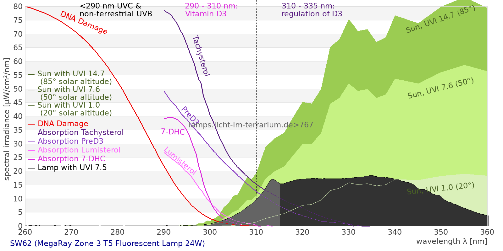 This process prevents any overdose of vitamin D3 from UV radiation with a spectrum similar to sunlight. As a comparison the solar spectra at 20°(id:14) and at 85°(id:21) solar angle are shown.