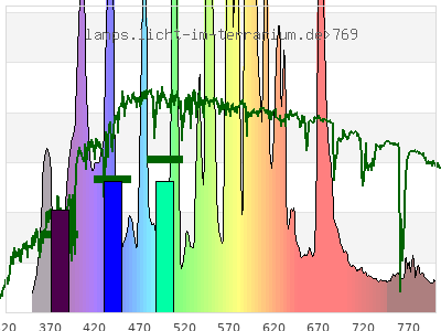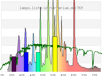 Whereas a spectrometer measures the intensity in every tiny wavelength interval resulting in thousands of individual intensities, the human eye only measures three intensities detected by the three cones. The same is true for the reptile eye with usually three or four photoreceptors. Effectively the detailled spectrum displayed above reduces to a much compacter bar graph displayed below. The photoreceptor sensitivites from these L-Cone, M-Cone, S-Cone, and U-Cone are used, they are chosen as an average of measured reptile photoreceptor sensitivity curves. The bar graph also shows as reference the intensity seen by the three or four photoreceptors for average sunlight (ASTM spectrum).