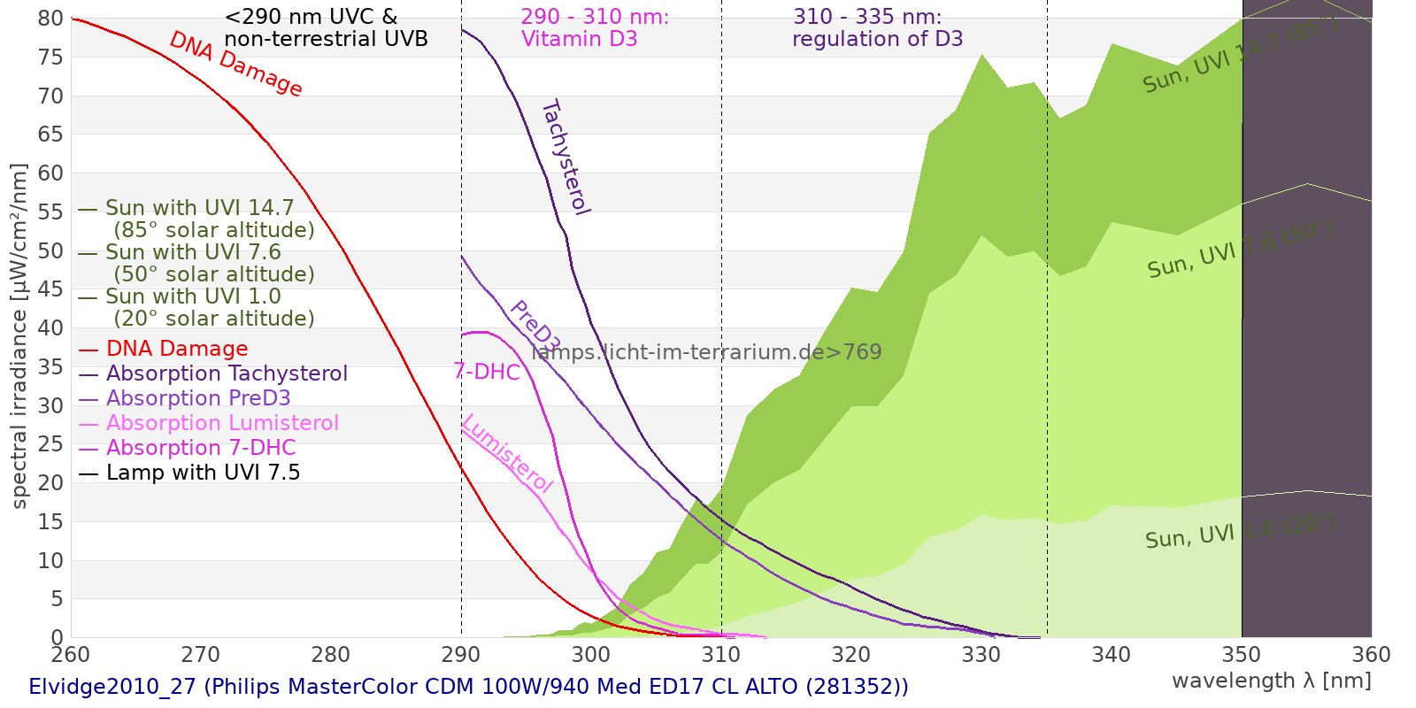 This process prevents any overdose of vitamin D3 from UV radiation with a spectrum similar to sunlight. As a comparison the solar spectra at 20°(id:14) and at 85°(id:21) solar angle are shown.