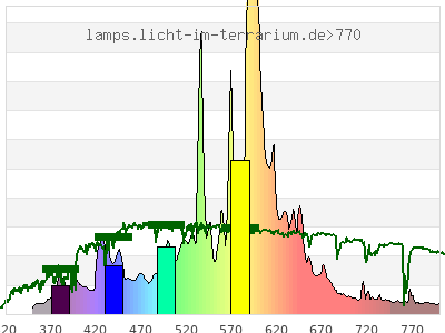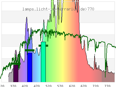 Whereas a spectrometer measures the intensity in every tiny wavelength interval resulting in thousands of individual intensities, the human eye only measures three intensities detected by the three cones. The same is true for the reptile eye with usually three or four photoreceptors. Effectively the detailled spectrum displayed above reduces to a much compacter bar graph displayed below. The photoreceptor sensitivites from these L-Cone, M-Cone, S-Cone, and U-Cone are used, they are chosen as an average of measured reptile photoreceptor sensitivity curves. The bar graph also shows as reference the intensity seen by the three or four photoreceptors for average sunlight (ASTM spectrum).