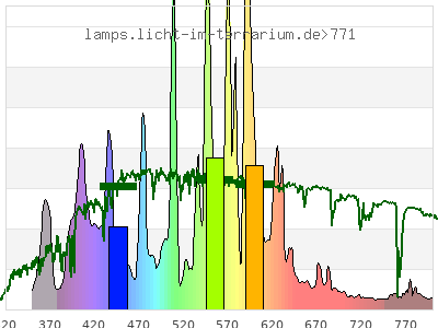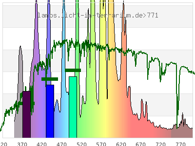 Whereas a spectrometer measures the intensity in every tiny wavelength interval resulting in thousands of individual intensities, the human eye only measures three intensities detected by the three cones. The same is true for the reptile eye with usually three or four photoreceptors. Effectively the detailled spectrum displayed above reduces to a much compacter bar graph displayed below. The photoreceptor sensitivites from these L-Cone, M-Cone, S-Cone, and U-Cone are used, they are chosen as an average of measured reptile photoreceptor sensitivity curves. The bar graph also shows as reference the intensity seen by the three or four photoreceptors for average sunlight (ASTM spectrum).