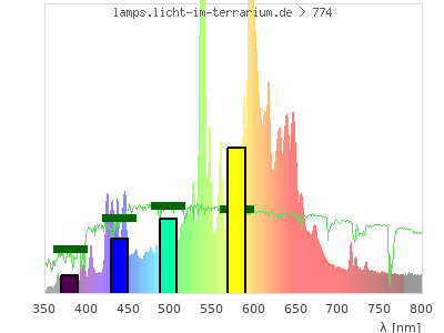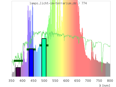 total ( 0 nm - 0 nm) 15200 µW/cm² = 152 W/m² UVC ( 0 nm - 280 nm) 0 µW/cm² = 0 W/m² non-terrestrial ( 0 nm - 290 nm) 0 µW/cm² = 0 W/m² total2 ( 250 nm - 880 nm) 15100 µW/cm² = 151 W/m² UVB (EU) ( 280 nm - 315 nm) 2.58 µW/cm² = 0.0258 W/m² UVB (US) ( 280 nm - 320 nm) 4.01 µW/cm² = 0.0401 W/m² UVA+B ( 280 nm - 380 nm) 124 µW/cm² = 1.24 W/m² Solar UVB ( 290 nm - 315 nm) 2.58 µW/cm² = 0.0258 W/m² UVA D3 regulating ( 315 nm - 335 nm) 4.51 µW/cm² = 0.0451 W/m² UVA (EU) ( 315 nm - 380 nm) 122 µW/cm² = 1.22 W/m² UVA2 (medical definition) ( 320 nm - 340 nm) 3.98 µW/cm² = 0.0398 W/m² UVA (US) ( 320 nm - 380 nm) 120 µW/cm² = 1.2 W/m² UVA1 (variant) ( 335 nm - 380 nm) 117 µW/cm² = 1.17 W/m² UVA1 (medical) ( 340 nm - 400 nm) 246 µW/cm² = 2.46 W/m² vis. UVA ( 350 nm - 380 nm) 114 µW/cm² = 1.14 W/m² VIS Rep3 ( 350 nm - 600 nm) 7790 µW/cm² = 77.9 W/m² VIS Rep4 ( 350 nm - 700 nm) 12500 µW/cm² = 125 W/m² purple ( 380 nm - 420 nm) 346 µW/cm² = 3.46 W/m² VIS ( 380 nm - 780 nm) 13200 µW/cm² = 132 W/m² VIS2 ( 400 nm - 680 nm) 12000 µW/cm² = 120 W/m² PAR ( 400 nm - 700 nm) 12300 µW/cm² = 123 W/m² tmp ( 400 nm - 1100 nm) 14900 µW/cm² = 149 W/m² blue ( 420 nm - 490 nm) 1620 µW/cm² = 16.2 W/m² green ( 490 nm - 575 nm) 3800 µW/cm² = 38 W/m² yellow ( 575 nm - 585 nm) 355 µW/cm² = 3.55 W/m² orange ( 585 nm - 650 nm) 5140 µW/cm² = 51.4 W/m² red ( 650 nm - 780 nm) 1960 µW/cm² = 19.6 W/m² IRA ( 700 nm - 1400 nm) 2650 µW/cm² = 26.5 W/m² IR2 ( 720 nm - 1100 nm) 2400 µW/cm² = 24 W/m² IRB ( 1400 nm - 3000 nm) 0 µW/cm² = 0 W/m²