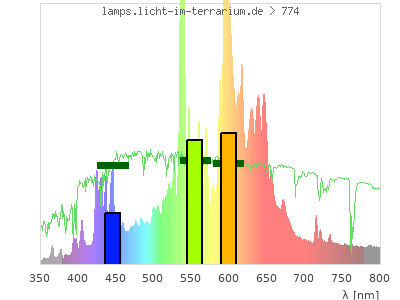 Whereas a spectrometer measures the intensity in every tiny wavelength interval resulting in thousands of individual intensities, the human eye only measures three intensities detected by the three cones. The same is true for the reptile eye with usually three or four photoreceptors. Effectively the detailled spectrum displayed above reduces to a much compacter bar graph displayed below. The photoreceptor sensitivites from these L-Cone, M-Cone, S-Cone, and U-Cone are used, they are chosen as an average of measured reptile photoreceptor sensitivity curves. The bar graph also shows as reference the intensity seen by the three or four photoreceptors for average sunlight (id 1).