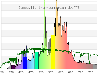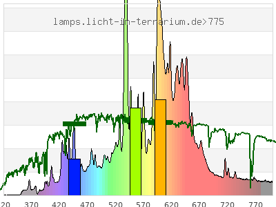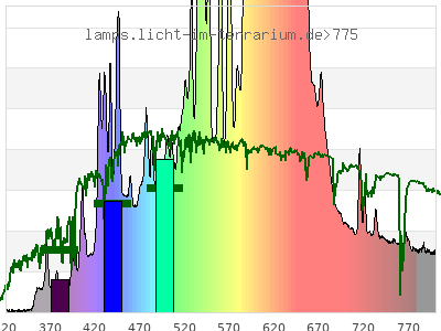 total ( 0 nm - 0 nm) 16000 µW/cm² = 160 W/m² UVC ( 0 nm - 280 nm) 0 µW/cm² = 0 W/m² non-terrestrial ( 0 nm - 290 nm) 0 µW/cm² = 0 W/m² total2 ( 250 nm - 880 nm) 16000 µW/cm² = 160 W/m² UVB (EU) ( 280 nm - 315 nm) 4.96 µW/cm² = 0.0496 W/m² UVB (US) ( 280 nm - 320 nm) 6.74 µW/cm² = 0.0674 W/m² UVA+B ( 280 nm - 380 nm) 145 µW/cm² = 1.45 W/m² Solar UVB ( 290 nm - 315 nm) 4.96 µW/cm² = 0.0496 W/m² UVA D3 regulating ( 315 nm - 335 nm) 5.97 µW/cm² = 0.0597 W/m² UVA (EU) ( 315 nm - 380 nm) 140 µW/cm² = 1.4 W/m² UVA2 (medical definition) ( 320 nm - 340 nm) 5.3 µW/cm² = 0.053 W/m² UVA (US) ( 320 nm - 380 nm) 138 µW/cm² = 1.38 W/m² UVA1 (variant) ( 335 nm - 380 nm) 134 µW/cm² = 1.34 W/m² UVA1 (medical) ( 340 nm - 400 nm) 233 µW/cm² = 2.33 W/m² vis. UVA ( 350 nm - 380 nm) 129 µW/cm² = 1.29 W/m² VIS Rep3 ( 350 nm - 600 nm) 7550 µW/cm² = 75.5 W/m² VIS Rep4 ( 350 nm - 700 nm) 13000 µW/cm² = 130 W/m² purple ( 380 nm - 420 nm) 312 µW/cm² = 3.12 W/m² VIS ( 380 nm - 780 nm) 13800 µW/cm² = 138 W/m² VIS2 ( 400 nm - 680 nm) 12500 µW/cm² = 125 W/m² PAR ( 400 nm - 700 nm) 12800 µW/cm² = 128 W/m² tmp ( 400 nm - 1100 nm) 15800 µW/cm² = 158 W/m² blue ( 420 nm - 490 nm) 1650 µW/cm² = 16.5 W/m² green ( 490 nm - 575 nm) 3660 µW/cm² = 36.6 W/m² yellow ( 575 nm - 585 nm) 366 µW/cm² = 3.66 W/m² orange ( 585 nm - 650 nm) 5490 µW/cm² = 54.9 W/m² red ( 650 nm - 780 nm) 2350 µW/cm² = 23.5 W/m² IR2 ( 655 nm - 685 nm) 942 µW/cm² = 9.42 W/m² IRA ( 700 nm - 1400 nm) 3000 µW/cm² = 30 W/m² IRB ( 1400 nm - 3000 nm) 0 µW/cm² = 0 W/m²