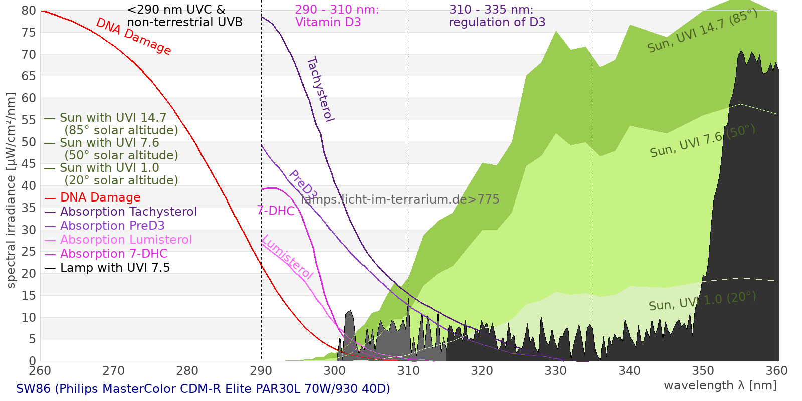 Erythema 0.411 UV-Index Pyrimidine dimerization of DNA 3.64 µW/cm² Photoceratitis 0.596 µW/cm² Photoconjunctivitis 0.0101 µW/cm² DNA Damage 0.0324 Vitamin D3 1.94 µW/cm² Photosynthesis 8370 µW/cm² Luminosity 43100 lx Human L-Cone 6760 µW/cm² Human M-Cone 4710 µW/cm² Human S-Cone 1330 µW/cm² CIE X 6550 µW/cm² CIE Y 5980 µW/cm² CIE Z 2480 µW/cm² PAR PPFD 621 µmol/m²/s Extinction preD3 8.8 e-3*m²/mol Extinction Tachysterol 29.3 e-3*m²/mol Exctincition PreD3 3980 m²/mol Extinction Lumisterol 1.67 m²/mol Exctincition Tachysterol 39900 m²/mol Extinction 7DHC 1.01 m²/mol L-Cone 6140 µW/cm² M-Cone 3070 µW/cm² S-Cone 2220 µW/cm² U-Cone 662 µW/cm² UVR - ICNIRP 2004 0.339 Rel Biol Eff Melatonin Supression 2010 µW/cm² Blue Light Hazard 1530 µW/cm² (35.5 µW/cm² per 1000 lx) CIE 174:2006 PreVit D3 2.23 µW/cm² Lumen Reptil 31900 "pseudo-lx" Vitamin D3 Degradation 1.41 µW/cm² Actinic UV 0.326 µW/cm² (0.0756 mW/klm) Exctincition Lumisterol 2290 m²/mol Exctincition 7DHC 1340 m²/mol Exctincition Toxisterols 592 m²/mol