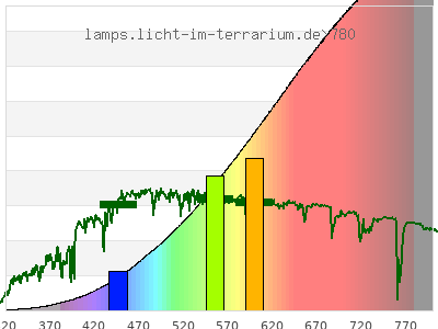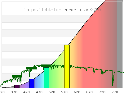 Whereas a spectrometer measures the intensity in every tiny wavelength interval resulting in thousands of individual intensities, the human eye only measures three intensities detected by the three cones. The same is true for the reptile eye with usually three or four photoreceptors. Effectively the detailled spectrum displayed above reduces to a much compacter bar graph displayed below. The photoreceptor sensitivites from these L-Cone, M-Cone, S-Cone, and U-Cone are used, they are chosen as an average of measured reptile photoreceptor sensitivity curves. The bar graph also shows as reference the intensity seen by the three or four photoreceptors for average sunlight (ASTM spectrum).