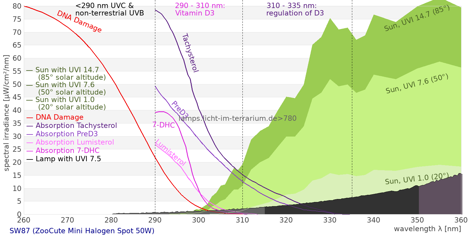 This process prevents any overdose of vitamin D3 from UV radiation with a spectrum similar to sunlight. As a comparison the solar spectra at 20°(id:14) and at 85°(id:21) solar angle are shown.
