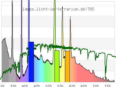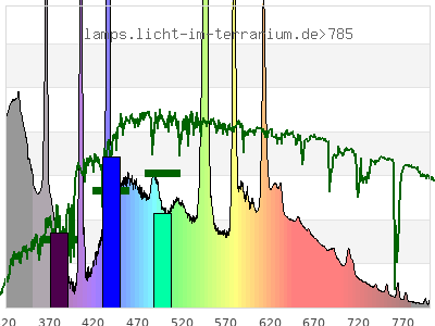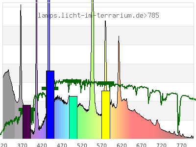 total ( 0 nm - 0 nm) 2060 µW/cm² = 20.6 W/m² UVC ( 0 nm - 280 nm) 0.14 µW/cm² = 0.0014 W/m² non-terrestrial ( 0 nm - 290 nm) 0.729 µW/cm² = 0.00729 W/m² total2 ( 250 nm - 880 nm) 2060 µW/cm² = 20.6 W/m² UVB (EU) ( 280 nm - 315 nm) 68.5 µW/cm² = 0.685 W/m² UVB (US) ( 280 nm - 320 nm) 101 µW/cm² = 1.01 W/m² UVA+B ( 280 nm - 380 nm) 452 µW/cm² = 4.52 W/m² Solar UVB ( 290 nm - 315 nm) 67.9 µW/cm² = 0.679 W/m² UVA D3 regulating ( 315 nm - 335 nm) 143 µW/cm² = 1.43 W/m² UVA (EU) ( 315 nm - 380 nm) 383 µW/cm² = 3.83 W/m² UVA2 (medical definition) ( 320 nm - 340 nm) 144 µW/cm² = 1.44 W/m² UVA (US) ( 320 nm - 380 nm) 351 µW/cm² = 3.51 W/m² UVA1 (variant) ( 335 nm - 380 nm) 240 µW/cm² = 2.4 W/m² UVA1 (medical) ( 340 nm - 400 nm) 230 µW/cm² = 2.3 W/m² vis. UVA ( 350 nm - 380 nm) 149 µW/cm² = 1.49 W/m² VIS Rep3 ( 350 nm - 600 nm) 1330 µW/cm² = 13.3 W/m² VIS Rep4 ( 350 nm - 700 nm) 1670 µW/cm² = 16.7 W/m² purple ( 380 nm - 420 nm) 118 µW/cm² = 1.18 W/m² VIS ( 380 nm - 780 nm) 1590 µW/cm² = 15.9 W/m² VIS2 ( 400 nm - 680 nm) 1460 µW/cm² = 14.6 W/m² PAR ( 400 nm - 700 nm) 1500 µW/cm² = 15 W/m² tmp ( 400 nm - 1100 nm) 1580 µW/cm² = 15.8 W/m² blue ( 420 nm - 490 nm) 477 µW/cm² = 4.77 W/m² green ( 490 nm - 575 nm) 442 µW/cm² = 4.42 W/m² yellow ( 575 nm - 585 nm) 81 µW/cm² = 0.81 W/m² orange ( 585 nm - 650 nm) 283 µW/cm² = 2.83 W/m² red ( 650 nm - 780 nm) 188 µW/cm² = 1.88 W/m² IR2 ( 655 nm - 685 nm) 75.3 µW/cm² = 0.753 W/m² IRA ( 700 nm - 1400 nm) 82.4 µW/cm² = 0.824 W/m² IRB ( 1400 nm - 3000 nm) 0 µW/cm² = 0 W/m²