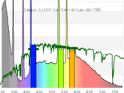 total ( 0 nm - 0 nm) 2930 µW/cm² = 29.3 W/m² UVC ( 0 nm - 280 nm) 0.472 µW/cm² = 0.00472 W/m² non-terrestrial ( 0 nm - 290 nm) 1.4 µW/cm² = 0.014 W/m² total2 ( 250 nm - 880 nm) 2930 µW/cm² = 29.3 W/m² UVB (EU) ( 280 nm - 315 nm) 127 µW/cm² = 1.27 W/m² UVB (US) ( 280 nm - 320 nm) 194 µW/cm² = 1.94 W/m² UVA+B ( 280 nm - 380 nm) 843 µW/cm² = 8.43 W/m² Solar UVB ( 290 nm - 315 nm) 126 µW/cm² = 1.26 W/m² UVA D3 regulating ( 315 nm - 335 nm) 306 µW/cm² = 3.06 W/m² UVA (EU) ( 315 nm - 380 nm) 717 µW/cm² = 7.17 W/m² UVA2 (medical definition) ( 320 nm - 340 nm) 310 µW/cm² = 3.1 W/m² UVA (US) ( 320 nm - 380 nm) 649 µW/cm² = 6.49 W/m² UVA1 (variant) ( 335 nm - 380 nm) 411 µW/cm² = 4.11 W/m² UVA1 (medical) ( 340 nm - 400 nm) 370 µW/cm² = 3.7 W/m² vis. UVA ( 350 nm - 380 nm) 214 µW/cm² = 2.14 W/m² VIS Rep3 ( 350 nm - 600 nm) 1720 µW/cm² = 17.2 W/m² VIS Rep4 ( 350 nm - 700 nm) 2180 µW/cm² = 21.8 W/m² purple ( 380 nm - 420 nm) 183 µW/cm² = 1.83 W/m² VIS ( 380 nm - 780 nm) 2070 µW/cm² = 20.7 W/m² VIS2 ( 400 nm - 680 nm) 1880 µW/cm² = 18.8 W/m² PAR ( 400 nm - 700 nm) 1940 µW/cm² = 19.4 W/m² tmp ( 400 nm - 1100 nm) 2060 µW/cm² = 20.6 W/m² blue ( 420 nm - 490 nm) 541 µW/cm² = 5.41 W/m² green ( 490 nm - 575 nm) 577 µW/cm² = 5.77 W/m² yellow ( 575 nm - 585 nm) 119 µW/cm² = 1.19 W/m² orange ( 585 nm - 650 nm) 363 µW/cm² = 3.63 W/m² red ( 650 nm - 780 nm) 291 µW/cm² = 2.91 W/m² IR2 ( 655 nm - 685 nm) 119 µW/cm² = 1.19 W/m² IRA ( 700 nm - 1400 nm) 119 µW/cm² = 1.19 W/m² IRB ( 1400 nm - 3000 nm) 0 µW/cm² = 0 W/m²