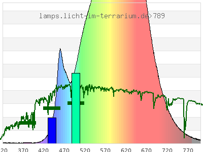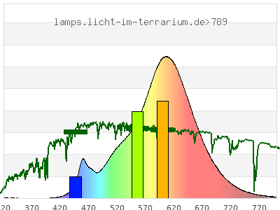 total ( 0 nm - 0 nm) 3530 µW/cm² = 35.3 W/m² UVC ( 0 nm - 280 nm) 0 µW/cm² = 0 W/m² non-terrestrial ( 0 nm - 290 nm) 0 µW/cm² = 0 W/m² total2 ( 250 nm - 880 nm) 3530 µW/cm² = 35.3 W/m² UVB (EU) ( 280 nm - 315 nm) 1.15 µW/cm² = 0.0115 W/m² UVB (US) ( 280 nm - 320 nm) 1.5 µW/cm² = 0.015 W/m² UVA+B ( 280 nm - 380 nm) 4.37 µW/cm² = 0.0437 W/m² Solar UVB ( 290 nm - 315 nm) 1.15 µW/cm² = 0.0115 W/m² UVA D3 regulating ( 315 nm - 335 nm) 1.26 µW/cm² = 0.0126 W/m² UVA (EU) ( 315 nm - 380 nm) 3.23 µW/cm² = 0.0323 W/m² UVA2 (medical definition) ( 320 nm - 340 nm) 1.15 µW/cm² = 0.0115 W/m² UVA (US) ( 320 nm - 380 nm) 2.88 µW/cm² = 0.0288 W/m² UVA1 (variant) ( 335 nm - 380 nm) 1.97 µW/cm² = 0.0197 W/m² UVA1 (medical) ( 340 nm - 400 nm) 2.59 µW/cm² = 0.0259 W/m² vis. UVA ( 350 nm - 380 nm) 1.25 µW/cm² = 0.0125 W/m² VIS Rep3 ( 350 nm - 600 nm) 1780 µW/cm² = 17.8 W/m² VIS Rep4 ( 350 nm - 700 nm) 3360 µW/cm² = 33.6 W/m² purple ( 380 nm - 420 nm) 3.94 µW/cm² = 0.0394 W/m² VIS ( 380 nm - 780 nm) 3510 µW/cm² = 35.1 W/m² VIS2 ( 400 nm - 680 nm) 3230 µW/cm² = 32.3 W/m² PAR ( 400 nm - 700 nm) 3360 µW/cm² = 33.6 W/m² tmp ( 400 nm - 1100 nm) 3520 µW/cm² = 35.2 W/m² blue ( 420 nm - 490 nm) 266 µW/cm² = 2.66 W/m² green ( 490 nm - 575 nm) 938 µW/cm² = 9.38 W/m² yellow ( 575 nm - 585 nm) 213 µW/cm² = 2.13 W/m² orange ( 585 nm - 650 nm) 1470 µW/cm² = 14.7 W/m² red ( 650 nm - 780 nm) 620 µW/cm² = 6.2 W/m² IR2 ( 655 nm - 685 nm) 314 µW/cm² = 3.14 W/m² IRA ( 700 nm - 1400 nm) 162 µW/cm² = 1.62 W/m² IRB ( 1400 nm - 3000 nm) 0 µW/cm² = 0 W/m²