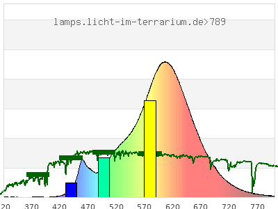 Whereas a spectrometer measures the intensity in every tiny wavelength interval resulting in thousands of individual intensities, the human eye only measures three intensities detected by the three cones. The same is true for the reptile eye with usually three or four photoreceptors. Effectively the detailled spectrum displayed above reduces to a much compacter bar graph displayed below. The photoreceptor sensitivites from these L-Cone, M-Cone, S-Cone, and U-Cone are used, they are chosen as an average of measured reptile photoreceptor sensitivity curves. The bar graph also shows as reference the intensity seen by the three or four photoreceptors for average sunlight (ASTM spectrum).