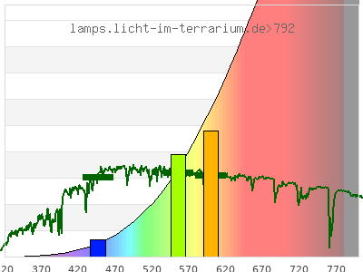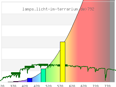 total ( 0 nm - 0 nm) 100000 µW/cm² = 1000 W/m² UVC ( 0 nm - 280 nm) 0 µW/cm² = 0 W/m² non-terrestrial ( 0 nm - 290 nm) 0 µW/cm² = 0 W/m² total2 ( 250 nm - 880 nm) 9220 µW/cm² = 92.2 W/m² UVB (EU) ( 280 nm - 315 nm) 0.002 µW/cm² = 2.0E-5 W/m² UVB (US) ( 280 nm - 320 nm) 0.0104 µW/cm² = 0.000104 W/m² UVA+B ( 280 nm - 380 nm) 3 µW/cm² = 0.03 W/m² Solar UVB ( 290 nm - 315 nm) 0.002 µW/cm² = 2.0E-5 W/m² UVA D3 regulating ( 315 nm - 335 nm) 0.111 µW/cm² = 0.00111 W/m² UVA (EU) ( 315 nm - 380 nm) 3 µW/cm² = 0.03 W/m² UVA2 (medical definition) ( 320 nm - 340 nm) 0.183 µW/cm² = 0.00183 W/m² UVA (US) ( 320 nm - 380 nm) 2.99 µW/cm² = 0.0299 W/m² UVA1 (variant) ( 335 nm - 380 nm) 2.89 µW/cm² = 0.0289 W/m² UVA1 (medical) ( 340 nm - 400 nm) 6.99 µW/cm² = 0.0699 W/m² vis. UVA ( 350 nm - 380 nm) 2.52 µW/cm² = 0.0252 W/m² VIS Rep3 ( 350 nm - 600 nm) 752 µW/cm² = 7.52 W/m² VIS Rep4 ( 350 nm - 700 nm) 2460 µW/cm² = 24.6 W/m² purple ( 380 nm - 420 nm) 11.9 µW/cm² = 0.119 W/m² VIS ( 380 nm - 780 nm) 4870 µW/cm² = 48.7 W/m² VIS2 ( 400 nm - 680 nm) 2000 µW/cm² = 20 W/m² PAR ( 400 nm - 700 nm) 2450 µW/cm² = 24.5 W/m² tmp ( 400 nm - 1100 nm) 22700 µW/cm² = 227 W/m² blue ( 420 nm - 490 nm) 87.9 µW/cm² = 0.879 W/m² green ( 490 nm - 575 nm) 414 µW/cm² = 4.14 W/m² yellow ( 575 nm - 585 nm) 86.5 µW/cm² = 0.865 W/m² orange ( 585 nm - 650 nm) 836 µW/cm² = 8.36 W/m² red ( 650 nm - 780 nm) 3430 µW/cm² = 34.3 W/m² IR2 ( 655 nm - 685 nm) 589 µW/cm² = 5.89 W/m² IRA ( 700 nm - 1400 nm) 41700 µW/cm² = 417 W/m² IRB ( 1400 nm - 3000 nm) 55800 µW/cm² = 558 W/m²
