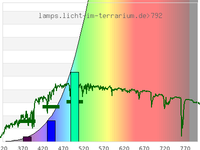 Whereas a spectrometer measures the intensity in every tiny wavelength interval resulting in thousands of individual intensities, the human eye only measures three intensities detected by the three cones. The same is true for the reptile eye with usually three or four photoreceptors. Effectively the detailled spectrum displayed above reduces to a much compacter bar graph displayed below. The photoreceptor sensitivites from these L-Cone, M-Cone, S-Cone, and U-Cone are used, they are chosen as an average of measured reptile photoreceptor sensitivity curves. The bar graph also shows as reference the intensity seen by the three or four photoreceptors for average sunlight (ASTM spectrum).