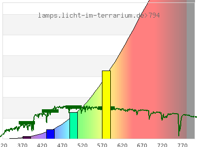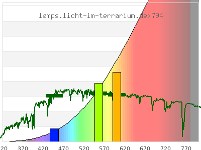 total ( 0 nm - 0 nm) 100000 µW/cm² = 1000 W/m² UVC ( 0 nm - 280 nm) 0 µW/cm² = 0 W/m² non-terrestrial ( 0 nm - 290 nm) 0 µW/cm² = 0 W/m² total2 ( 250 nm - 880 nm) 13000 µW/cm² = 130 W/m² UVB (EU) ( 280 nm - 315 nm) 0.00829 µW/cm² = 8.29E-5 W/m² UVB (US) ( 280 nm - 320 nm) 0.0424 µW/cm² = 0.000424 W/m² UVA+B ( 280 nm - 380 nm) 9.74 µW/cm² = 0.0974 W/m² Solar UVB ( 290 nm - 315 nm) 0.00829 µW/cm² = 8.29E-5 W/m² UVA D3 regulating ( 315 nm - 335 nm) 0.425 µW/cm² = 0.00425 W/m² UVA (EU) ( 315 nm - 380 nm) 9.74 µW/cm² = 0.0974 W/m² UVA2 (medical definition) ( 320 nm - 340 nm) 0.685 µW/cm² = 0.00685 W/m² UVA (US) ( 320 nm - 380 nm) 9.7 µW/cm² = 0.097 W/m² UVA1 (variant) ( 335 nm - 380 nm) 9.31 µW/cm² = 0.0931 W/m² UVA1 (medical) ( 340 nm - 400 nm) 21.1 µW/cm² = 0.211 W/m² vis. UVA ( 350 nm - 380 nm) 8 µW/cm² = 0.08 W/m² VIS Rep3 ( 350 nm - 600 nm) 1430 µW/cm² = 14.3 W/m² VIS Rep4 ( 350 nm - 700 nm) 4090 µW/cm² = 40.9 W/m² purple ( 380 nm - 420 nm) 32.7 µW/cm² = 0.327 W/m² VIS ( 380 nm - 780 nm) 7450 µW/cm² = 74.5 W/m² VIS2 ( 400 nm - 680 nm) 3400 µW/cm² = 34 W/m² PAR ( 400 nm - 700 nm) 4070 µW/cm² = 40.7 W/m² tmp ( 400 nm - 1100 nm) 28400 µW/cm² = 284 W/m² blue ( 420 nm - 490 nm) 200 µW/cm² = 2 W/m² green ( 490 nm - 575 nm) 784 µW/cm² = 7.84 W/m² yellow ( 575 nm - 585 nm) 151 µW/cm² = 1.51 W/m² orange ( 585 nm - 650 nm) 1370 µW/cm² = 13.7 W/m² red ( 650 nm - 780 nm) 4910 µW/cm² = 49.1 W/m² IR2 ( 655 nm - 685 nm) 898 µW/cm² = 8.98 W/m² IRA ( 700 nm - 1400 nm) 46200 µW/cm² = 462 W/m² IRB ( 1400 nm - 3000 nm) 49700 µW/cm² = 497 W/m²