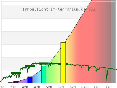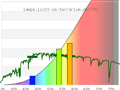 total ( 0 nm - 0 nm) 100000 µW/cm² = 1000 W/m² UVC ( 0 nm - 280 nm) 0 µW/cm² = 0 W/m² non-terrestrial ( 0 nm - 290 nm) 0 µW/cm² = 0 W/m² total2 ( 250 nm - 880 nm) 15000 µW/cm² = 150 W/m² UVB (EU) ( 280 nm - 315 nm) 0.0153 µW/cm² = 0.000153 W/m² UVB (US) ( 280 nm - 320 nm) 0.0776 µW/cm² = 0.000776 W/m² UVA+B ( 280 nm - 380 nm) 16.1 µW/cm² = 0.161 W/m² Solar UVB ( 290 nm - 315 nm) 0.0153 µW/cm² = 0.000153 W/m² UVA D3 regulating ( 315 nm - 335 nm) 0.757 µW/cm² = 0.00757 W/m² UVA (EU) ( 315 nm - 380 nm) 16.1 µW/cm² = 0.161 W/m² UVA2 (medical definition) ( 320 nm - 340 nm) 1.21 µW/cm² = 0.0121 W/m² UVA (US) ( 320 nm - 380 nm) 16 µW/cm² = 0.16 W/m² UVA1 (variant) ( 335 nm - 380 nm) 15.3 µW/cm² = 0.153 W/m² UVA1 (medical) ( 340 nm - 400 nm) 33.7 µW/cm² = 0.337 W/m² vis. UVA ( 350 nm - 380 nm) 13.1 µW/cm² = 0.131 W/m² VIS Rep3 ( 350 nm - 600 nm) 1880 µW/cm² = 18.8 W/m² VIS Rep4 ( 350 nm - 700 nm) 5050 µW/cm² = 50.5 W/m² purple ( 380 nm - 420 nm) 50.2 µW/cm² = 0.502 W/m² VIS ( 380 nm - 780 nm) 8880 µW/cm² = 88.8 W/m² VIS2 ( 400 nm - 680 nm) 4240 µW/cm² = 42.4 W/m² PAR ( 400 nm - 700 nm) 5020 µW/cm² = 50.2 W/m² tmp ( 400 nm - 1100 nm) 31000 µW/cm² = 310 W/m² blue ( 420 nm - 490 nm) 284 µW/cm² = 2.84 W/m² green ( 490 nm - 575 nm) 1020 µW/cm² = 10.2 W/m² yellow ( 575 nm - 585 nm) 191 µW/cm² = 1.91 W/m² orange ( 585 nm - 650 nm) 1670 µW/cm² = 16.7 W/m² red ( 650 nm - 780 nm) 5660 µW/cm² = 56.6 W/m² IR2 ( 655 nm - 685 nm) 1060 µW/cm² = 10.6 W/m² IRA ( 700 nm - 1400 nm) 47700 µW/cm² = 477 W/m² IRB ( 1400 nm - 3000 nm) 47200 µW/cm² = 472 W/m²