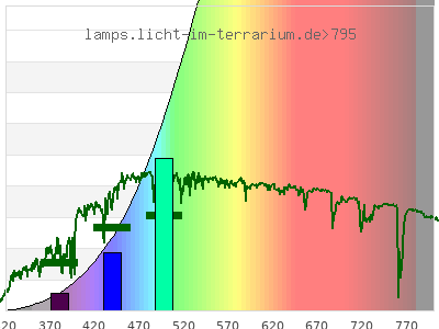 Whereas a spectrometer measures the intensity in every tiny wavelength interval resulting in thousands of individual intensities, the human eye only measures three intensities detected by the three cones. The same is true for the reptile eye with usually three or four photoreceptors. Effectively the detailled spectrum displayed above reduces to a much compacter bar graph displayed below. The photoreceptor sensitivites from these L-Cone, M-Cone, S-Cone, and U-Cone are used, they are chosen as an average of measured reptile photoreceptor sensitivity curves. The bar graph also shows as reference the intensity seen by the three or four photoreceptors for average sunlight (ASTM spectrum).