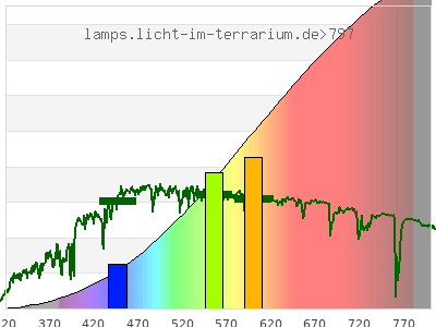 Whereas a spectrometer measures the intensity in every tiny wavelength interval resulting in thousands of individual intensities, the human eye only measures three intensities detected by the three cones. The same is true for the reptile eye with usually three or four photoreceptors. Effectively the detailled spectrum displayed above reduces to a much compacter bar graph displayed below. The photoreceptor sensitivites from these L-Cone, M-Cone, S-Cone, and U-Cone are used, they are chosen as an average of measured reptile photoreceptor sensitivity curves. The bar graph also shows as reference the intensity seen by the three or four photoreceptors for average sunlight (ASTM spectrum).