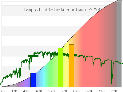 Whereas a spectrometer measures the intensity in every tiny wavelength interval resulting in thousands of individual intensities, the human eye only measures three intensities detected by the three cones. The same is true for the reptile eye with usually three or four photoreceptors. Effectively the detailled spectrum displayed above reduces to a much compacter bar graph displayed below. The photoreceptor sensitivites from these L-Cone, M-Cone, S-Cone, and U-Cone are used, they are chosen as an average of measured reptile photoreceptor sensitivity curves. The bar graph also shows as reference the intensity seen by the three or four photoreceptors for average sunlight (ASTM spectrum).