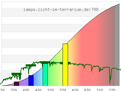total ( 0 nm - 0 nm) 100000 µW/cm² = 1000 W/m² UVC ( 0 nm - 280 nm) 0 µW/cm² = 0 W/m² non-terrestrial ( 0 nm - 290 nm) 0 µW/cm² = 0 W/m² total2 ( 250 nm - 880 nm) 23500 µW/cm² = 235 W/m² UVB (EU) ( 280 nm - 315 nm) 0.107 µW/cm² = 0.00107 W/m² UVB (US) ( 280 nm - 320 nm) 0.535 µW/cm² = 0.00535 W/m² UVA+B ( 280 nm - 380 nm) 80.2 µW/cm² = 0.802 W/m² Solar UVB ( 290 nm - 315 nm) 0.107 µW/cm² = 0.00107 W/m² UVA D3 regulating ( 315 nm - 335 nm) 4.78 µW/cm² = 0.0478 W/m² UVA (EU) ( 315 nm - 380 nm) 80.1 µW/cm² = 0.801 W/m² UVA2 (medical definition) ( 320 nm - 340 nm) 7.35 µW/cm² = 0.0735 W/m² UVA (US) ( 320 nm - 380 nm) 79.6 µW/cm² = 0.796 W/m² UVA1 (variant) ( 335 nm - 380 nm) 75.3 µW/cm² = 0.753 W/m² UVA1 (medical) ( 340 nm - 400 nm) 151 µW/cm² = 1.51 W/m² vis. UVA ( 350 nm - 380 nm) 62.7 µW/cm² = 0.627 W/m² VIS Rep3 ( 350 nm - 600 nm) 4450 µW/cm² = 44.5 W/m² VIS Rep4 ( 350 nm - 700 nm) 9910 µW/cm² = 99.1 W/m² purple ( 380 nm - 420 nm) 196 µW/cm² = 1.96 W/m² VIS ( 380 nm - 780 nm) 15500 µW/cm² = 155 W/m² VIS2 ( 400 nm - 680 nm) 8510 µW/cm² = 85.1 W/m² PAR ( 400 nm - 700 nm) 9770 µW/cm² = 97.7 W/m² tmp ( 400 nm - 1100 nm) 41100 µW/cm² = 411 W/m² blue ( 420 nm - 490 nm) 845 µW/cm² = 8.45 W/m² green ( 490 nm - 575 nm) 2330 µW/cm² = 23.3 W/m² yellow ( 575 nm - 585 nm) 387 µW/cm² = 3.87 W/m² orange ( 585 nm - 650 nm) 3090 µW/cm² = 30.9 W/m² red ( 650 nm - 780 nm) 8630 µW/cm² = 86.3 W/m² IR2 ( 655 nm - 685 nm) 1770 µW/cm² = 17.7 W/m² IRA ( 700 nm - 1400 nm) 51900 µW/cm² = 519 W/m² IRB ( 1400 nm - 3000 nm) 38200 µW/cm² = 382 W/m²