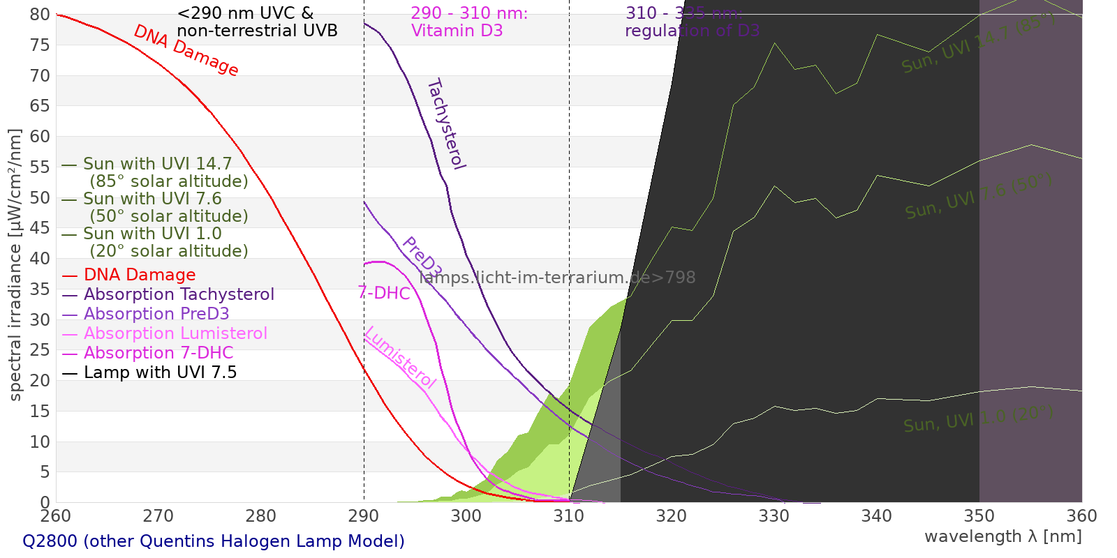 This process prevents any overdose of vitamin D3 from UV radiation with a spectrum similar to sunlight. As a comparison the solar spectra at 20°(id:14) and at 85°(id:21) solar angle are shown.