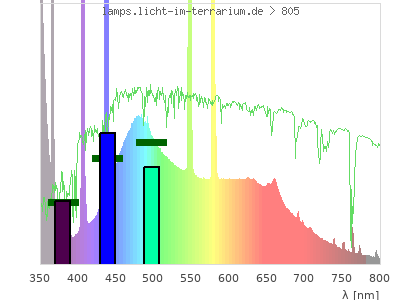total ( 0 nm - 0 nm) 910 µW/cm² = 9.1 W/m² UVC ( 0 nm - 280 nm) 0 µW/cm² = 0 W/m² non-terrestrial ( 0 nm - 290 nm) 0 µW/cm² = 0 W/m² total2 ( 250 nm - 880 nm) 910 µW/cm² = 9.1 W/m² UVB (EU) ( 280 nm - 315 nm) 25.5 µW/cm² = 0.255 W/m² UVB (US) ( 280 nm - 320 nm) 46.6 µW/cm² = 0.466 W/m² UVA+B ( 280 nm - 380 nm) 302 µW/cm² = 3.02 W/m² Solar UVB ( 290 nm - 315 nm) 25.5 µW/cm² = 0.255 W/m² UVA D3 regulating ( 315 nm - 335 nm) 111 µW/cm² = 1.11 W/m² UVA (EU) ( 315 nm - 380 nm) 277 µW/cm² = 2.77 W/m² UVA2 (medical definition) ( 320 nm - 340 nm) 126 µW/cm² = 1.26 W/m² UVA (US) ( 320 nm - 380 nm) 256 µW/cm² = 2.56 W/m² UVA1 (variant) ( 335 nm - 380 nm) 165 µW/cm² = 1.65 W/m² UVA1 (medical) ( 340 nm - 400 nm) 137 µW/cm² = 1.37 W/m² vis. UVA ( 350 nm - 380 nm) 66.4 µW/cm² = 0.664 W/m² VIS Rep3 ( 350 nm - 600 nm) 533 µW/cm² = 5.33 W/m² VIS Rep4 ( 350 nm - 700 nm) 645 µW/cm² = 6.45 W/m² purple ( 380 nm - 420 nm) 55 µW/cm² = 0.55 W/m² VIS ( 380 nm - 780 nm) 605 µW/cm² = 6.05 W/m² VIS2 ( 400 nm - 680 nm) 556 µW/cm² = 5.56 W/m² PAR ( 400 nm - 700 nm) 570 µW/cm² = 5.7 W/m² tmp ( 400 nm - 1100 nm) 599 µW/cm² = 5.99 W/m² blue ( 420 nm - 490 nm) 186 µW/cm² = 1.86 W/m² green ( 490 nm - 575 nm) 176 µW/cm² = 1.76 W/m² yellow ( 575 nm - 585 nm) 29.6 µW/cm² = 0.296 W/m² orange ( 585 nm - 650 nm) 84.4 µW/cm² = 0.844 W/m² red ( 650 nm - 780 nm) 73.2 µW/cm² = 0.732 W/m² IRA ( 700 nm - 1400 nm) 28.7 µW/cm² = 0.287 W/m² IR2 ( 720 nm - 1100 nm) 18.6 µW/cm² = 0.186 W/m² IRB ( 1400 nm - 3000 nm) 0 µW/cm² = 0 W/m²