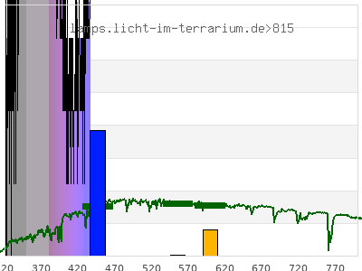 total ( 0 nm - 0 nm) 495 µW/cm² = 4.95 W/m² UVC ( 0 nm - 280 nm) 0 µW/cm² = 0 W/m² non-terrestrial ( 0 nm - 290 nm) 0 µW/cm² = 0 W/m² total2 ( 250 nm - 880 nm) 495 µW/cm² = 4.95 W/m² UVB (EU) ( 280 nm - 315 nm) 0 µW/cm² = 0 W/m² UVB (US) ( 280 nm - 320 nm) 0 µW/cm² = 0 W/m² UVA+B ( 280 nm - 380 nm) 485 µW/cm² = 4.85 W/m² Solar UVB ( 290 nm - 315 nm) 0 µW/cm² = 0 W/m² UVA D3 regulating ( 315 nm - 335 nm) 0.448 µW/cm² = 0.00448 W/m² UVA (EU) ( 315 nm - 380 nm) 485 µW/cm² = 4.85 W/m² UVA2 (medical definition) ( 320 nm - 340 nm) 0.734 µW/cm² = 0.00734 W/m² UVA (US) ( 320 nm - 380 nm) 485 µW/cm² = 4.85 W/m² UVA1 (variant) ( 335 nm - 380 nm) 485 µW/cm² = 4.85 W/m² UVA1 (medical) ( 340 nm - 400 nm) 493 µW/cm² = 4.93 W/m² vis. UVA ( 350 nm - 380 nm) 484 µW/cm² = 4.84 W/m² VIS Rep3 ( 350 nm - 600 nm) 493 µW/cm² = 4.93 W/m² VIS Rep4 ( 350 nm - 700 nm) 493 µW/cm² = 4.93 W/m² purple ( 380 nm - 420 nm) 9.01 µW/cm² = 0.0901 W/m² VIS ( 380 nm - 780 nm) 9.51 µW/cm² = 0.0951 W/m² VIS2 ( 400 nm - 680 nm) 0.986 µW/cm² = 0.00986 W/m² PAR ( 400 nm - 700 nm) 0.986 µW/cm² = 0.00986 W/m² tmp ( 400 nm - 1100 nm) 0.986 µW/cm² = 0.00986 W/m² blue ( 420 nm - 490 nm) 0.506 µW/cm² = 0.00506 W/m² green ( 490 nm - 575 nm) 0 µW/cm² = 0 W/m² yellow ( 575 nm - 585 nm) 0 µW/cm² = 0 W/m² orange ( 585 nm - 650 nm) 0 µW/cm² = 0 W/m² red ( 650 nm - 780 nm) 0 µW/cm² = 0 W/m² IR2 ( 655 nm - 685 nm) 0 µW/cm² = 0 W/m² IRA ( 700 nm - 1400 nm) 0 µW/cm² = 0 W/m² IRB ( 1400 nm - 3000 nm) 0 µW/cm² = 0 W/m²
