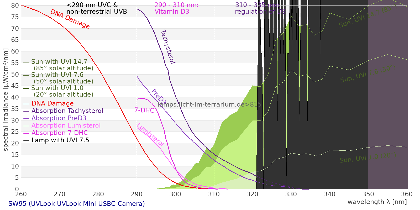 This process prevents any overdose of vitamin D3 from UV radiation with a spectrum similar to sunlight. As a comparison the solar spectra at 20°(id:14) and at 85°(id:21) solar angle are shown.