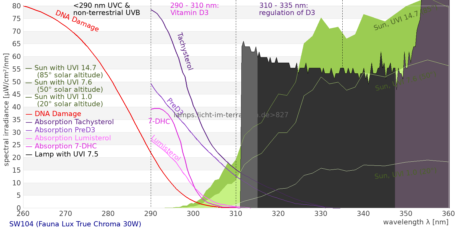 Erythema 0.0859 UV-Index Pyrimidine dimerization of DNA 0.644 µW/cm² Photoceratitis 0.0602 µW/cm² Photoconjunctivitis 0 µW/cm² DNA Damage 0.00073 Vitamin D3 0.124 µW/cm² Photosynthesis 7980 µW/cm² Luminosity 32500 lx Human L-Cone 4880 µW/cm² Human M-Cone 4000 µW/cm² Human S-Cone 2130 µW/cm² CIE X 4390 µW/cm² CIE Y 4500 µW/cm² CIE Z 4090 µW/cm² PAR PPFD 540 µmol/m²/s Extinction preD3 2.14 e-3*m²/mol Extinction Tachysterol 8.09 e-3*m²/mol Exctincition PreD3 1050 m²/mol Extinction Lumisterol 0.0286 m²/mol Exctincition Tachysterol 12300 m²/mol Extinction 7DHC 0 m²/mol L-Cone 4190 µW/cm² M-Cone 4420 µW/cm² S-Cone 3230 µW/cm² U-Cone 1390 µW/cm² UVR - ICNIRP 2004 0.0477 Rel Biol Eff Melatonin Supression 3430 µW/cm² Blue Light Hazard 2390 µW/cm² (73.4 µW/cm² per 1000 lx) CIE 174:2006 PreVit D3 0.108 µW/cm² Lumen Reptil 31800 "pseudo-lx" Vitamin D3 Degradation 0.438 µW/cm² Actinic UV 0.0478 µW/cm² (0.0147 mW/klm) Exctincition Lumisterol 143 m²/mol Exctincition 7DHC 34.8 m²/mol Exctincition Toxisterols 234 m²/mol