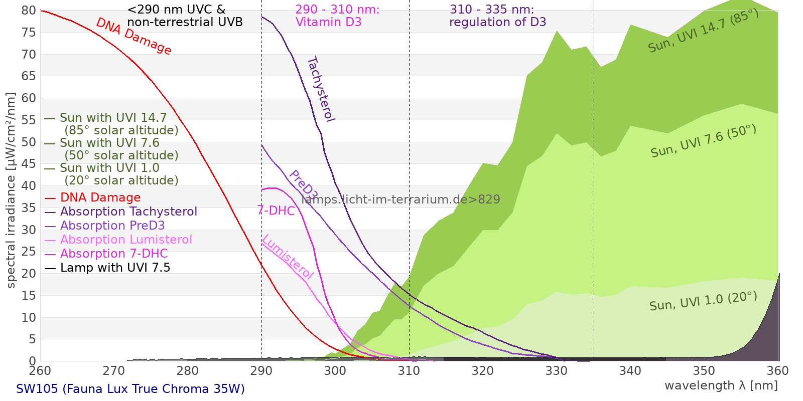 Erythema 1.2 UV-Index Pyrimidine dimerization of DNA 2.16 µW/cm² Photoceratitis 1.75 µW/cm² Photoconjunctivitis 0.5 µW/cm² DNA Damage 0.92 Vitamin D3 2.78 µW/cm² Photosynthesis 4080 µW/cm² Luminosity 16500 lx Human L-Cone 2480 µW/cm² Human M-Cone 2040 µW/cm² Human S-Cone 1090 µW/cm² CIE X 2230 µW/cm² CIE Y 2290 µW/cm² CIE Z 2070 µW/cm² PAR PPFD 277 µmol/m²/s Extinction preD3 16.2 e-3*m²/mol Extinction Tachysterol 57.7 e-3*m²/mol Exctincition PreD3 11600 m²/mol Extinction Lumisterol 13.6 m²/mol Exctincition Tachysterol 74500 m²/mol Extinction 7DHC 17.7 m²/mol L-Cone 2130 µW/cm² M-Cone 2220 µW/cm² S-Cone 1670 µW/cm² U-Cone 810 µW/cm² UVR - ICNIRP 2004 1.89 Rel Biol Eff Melatonin Supression 1740 µW/cm² Blue Light Hazard 1220 µW/cm² (73.9 µW/cm² per 1000 lx) CIE 174:2006 PreVit D3 2.87 µW/cm² Lumen Reptil 16300 "pseudo-lx" Vitamin D3 Degradation 1.99 µW/cm² Actinic UV 1.87 µW/cm² (1.13 mW/klm) Exctincition Lumisterol 15800 m²/mol Exctincition 7DHC 20000 m²/mol Exctincition Toxisterols 974 m²/mol