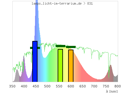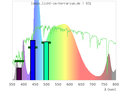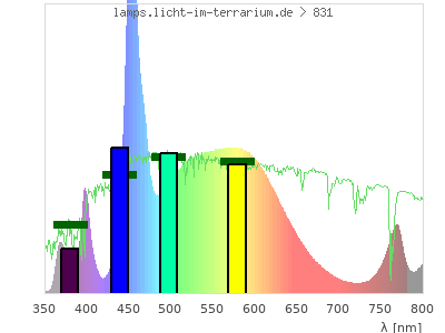 Whereas a spectrometer measures the intensity in every tiny wavelength interval resulting in thousands of individual intensities, the human eye only measures three intensities detected by the three cones. The same is true for the reptile eye with usually three or four photoreceptors. Effectively the detailled spectrum displayed above reduces to a much compacter bar graph displayed below. The photoreceptor sensitivites from these L-Cone, M-Cone, S-Cone, and U-Cone are used, they are chosen as an average of measured reptile photoreceptor sensitivity curves. The bar graph also shows as reference the intensity seen by the three or four photoreceptors for average sunlight (id 1).