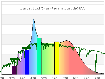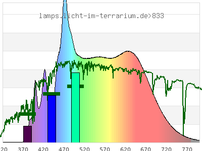 Whereas a spectrometer measures the intensity in every tiny wavelength interval resulting in thousands of individual intensities, the human eye only measures three intensities detected by the three cones. The same is true for the reptile eye with usually three or four photoreceptors. Effectively the detailled spectrum displayed above reduces to a much compacter bar graph displayed below. The photoreceptor sensitivites from these L-Cone, M-Cone, S-Cone, and U-Cone are used, they are chosen as an average of measured reptile photoreceptor sensitivity curves. The bar graph also shows as reference the intensity seen by the three or four photoreceptors for average sunlight (ASTM spectrum).