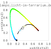 From these three numbers the colour coordinate and the correlated colour temperature for humans are calculated using the CIE standard method. I adapted this concept to a "3 cone reptile (M,S,U)" and a "4 cone reptile (L,M,S,U)". I am sure, that this adaption to other colour spaces makes sense mathematically and this is also done in scientific research regarding colour vision of animals, however I have not seen calculation of colour temperatures for other animals in the scientific literature. Even if it is hypothetical, at least this shows, how arbitrary the colour temperature is, and that the colour temperature calculated for humans does not apply to reptiles. The colour spaces also show the colour coordinates of different phases of daylight ((ids 1, 338 – 451, 511 – 513 ), indicated by crosses, coloured in the appriximate colour perceived by a human.